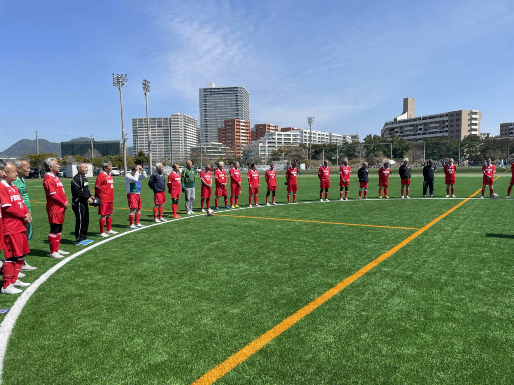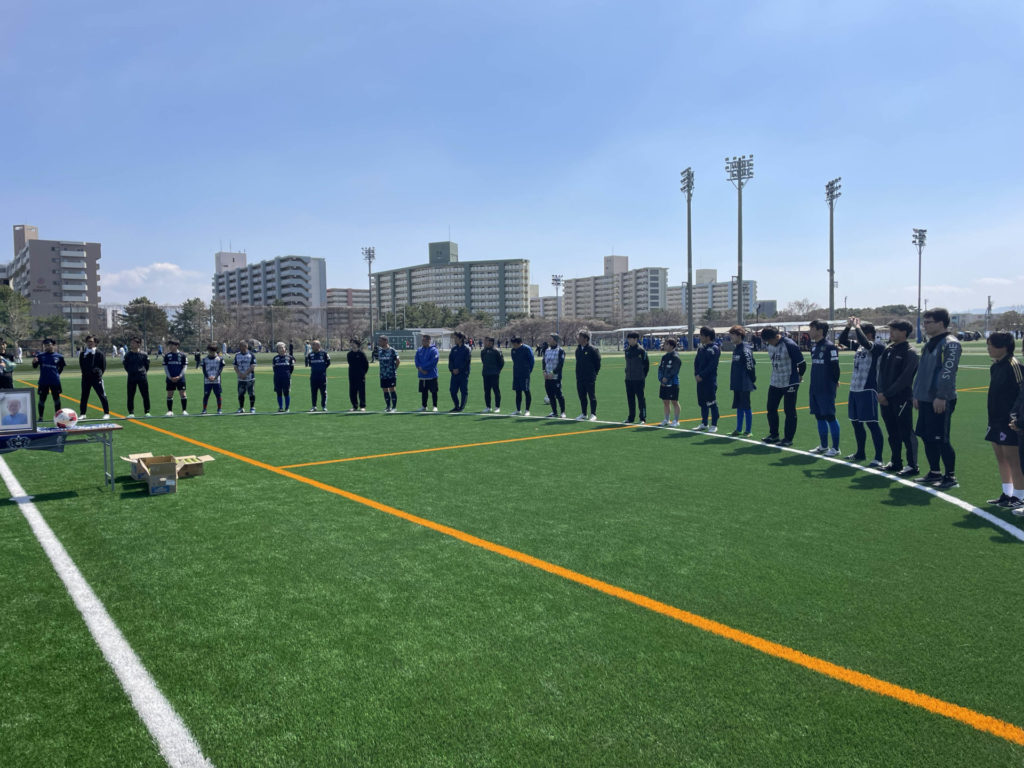 春分の日、この日も好天に恵まれアビスパファミリーのみなさんととパッセロ福岡の交流試合が開催されました。交流試合の前には、福岡県のサッカーの繁栄にご尽力をいただき、昨年お亡くなりになった故 井上辰馬氏への黙祷、献杯が執り行われました。